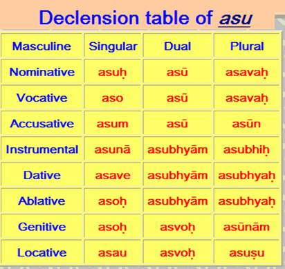 所以七转就有九例,七转又作七声、七例或苏漫多声(subanta),乃梵语文法上表示名词等语尾之变化者。苏盘多梵 subanta。又作苏漫多、苏曼多。系指梵语中名词、形容词等语尾变化之语。即依八转声法变化语尾之语。苏(su)为语尾之声,盘多(banta)为后之义,故苏盘多即语尾有 su 之意。「苏盘多」一语,源于梵语名词多言声(复数)中第七之所依声(于格)语尾含有苏音。有一言声(单数)、二言声(双数)、多言声(复数)之别,各有八转,总成二十四个语尾变化(二十四转)。底下是asu呼吸之意为例,一单数、二双数、三复数。经由呼格,再七转成八,三数即成24转。