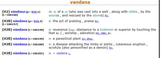 和南盖梵语 vandana乃以 vand(有赞赏、尊崇之义)为语根,附加后接字 ana 所成者。
